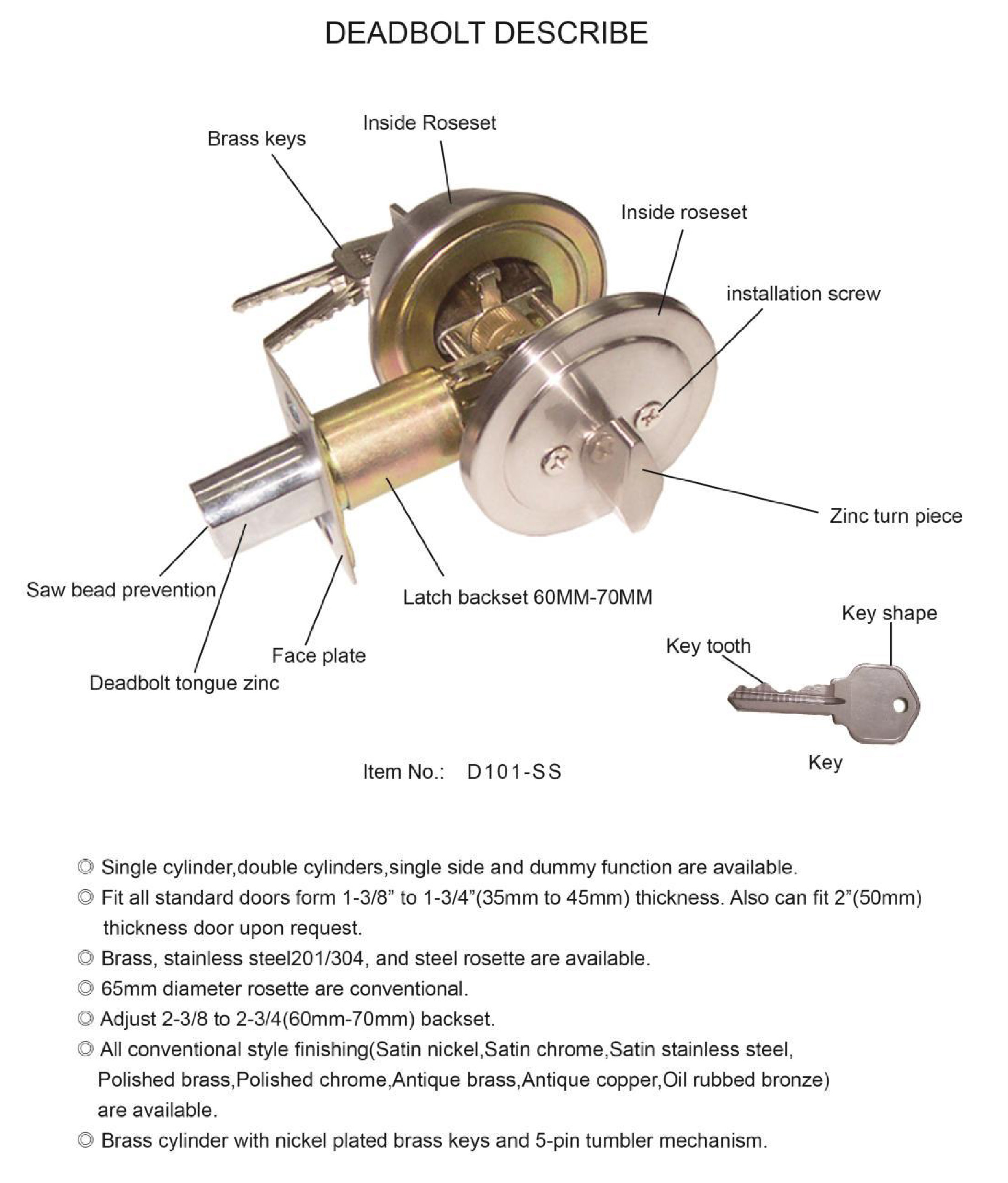 ["zidingyi"] => string(14391) "<p style="text-align: left;"><span style="font-family: undefined;">?lt;/span><span style="font-size: large; color: rgb(51, 51, 51); font-family: Roboto; font-weight: bold;"><br></span></p><table class="table table-bordered"><tbody><tr><td style="text-align: center;"><p style="text-align: center;"><font face="Raleway"><span style="font-size: 36px;"><b>DEADBOLT DOOR LOCK</b></span></font></p><p class="15" style=""><span style="font-size: 18px;">TOP 5 Manufactures of Door Locks ! More Than 25 years Producing Experience in Lock & Hardware Industry. Up to 120 Days Credit Payment for VIP Clients.</span><o:p></o:p></p><p><br></p></td></tr></tbody></table><div class="magic-2" style="margin: 0px; padding: 0px 4px; border: 0px; font-variant-numeric: inherit; font-variant-east-asian: inherit; font-stretch: inherit; line-height: inherit; vertical-align: top;"><div class="magic-3" style="margin: 0px; padding: 4px 0px; border: 0px; font-variant-numeric: inherit; font-variant-east-asian: inherit; font-stretch: inherit; line-height: inherit; vertical-align: top;"><div class="magic-4" style="font-variant-numeric: inherit; font-variant-east-asian: inherit; box-sizing: content-box; margin: 0px; padding: 0px; border: 0px; font-stretch: inherit; line-height: inherit; vertical-align: baseline;"><font size="3"><div style="box-sizing: content-box; text-align: left;"><div class="magic-2" style="font-size: 12px; margin: 0px; padding: 0px 4px; border: 0px; font-variant-numeric: inherit; font-variant-east-asian: inherit; font-stretch: inherit; line-height: inherit; vertical-align: top;"><div class="magic-3" style="margin: 0px; padding: 4px 0px; border: 0px; font-variant-numeric: inherit; font-variant-east-asian: inherit; font-stretch: inherit; line-height: inherit; vertical-align: top;"><div class="magic-4" style="box-sizing: content-box; font-variant-numeric: inherit; font-variant-east-asian: inherit; margin: 0px; padding: 0px; border: 0px; font-stretch: inherit; line-height: inherit; vertical-align: baseline;"><font size="3"><div style="box-sizing: content-box;"><b style="font-size: 18px;">Product Description</b><br></div></font></div></div></div><table class="table table-bordered" style="width: 833px; font-size: 12px;"><tbody><tr><td style="line-height: 1.42857;"><span style="font-size: 18px;"><b>Function</b></span></td><td style="line-height: 1.42857;"><span style="font-size: 18px;">Entrance / Storeroom / Privacy /Passage /Dummy</span><br></td></tr><tr><td style="line-height: 1.42857;"><span style="font-size: 18px;"><b>Material</b></span></td><td style="line-height: 1.42857;"><span style="font-size: 18px;">Stainless steel / Brass upon request</span><br></td></tr><tr><td style="line-height: 1.42857;"><span style="font-size: 18px;"><b>Rosette</b></span></td><td style="line-height: 1.42857;"><span style="font-size: 18px;">Diameter 65 mm,70mm,75 mm,80mm,optional upon request</span><br></td></tr><tr><td style="line-height: 1.42857;"><span style="font-size: 18px;"><b>Keyway</b></span></td><td style="line-height: 1.42857;"><span style="font-size: 18px;">Schlage / C4 / Waiser etc.available upon uesers</span><br></td></tr><tr><td style="line-height: 1.42857;"><span style="font-size: 18px;"><b>Door thick</b></span></td><td style="line-height: 1.42857;"><span style="font-size: 18px;">Door thick fitted 35-45mm</span><br></td></tr><tr><td style="line-height: 1.42857;"><span style="font-size: 18px;"><b>Knob</b></span></td><td style="line-height: 1.42857;"><span style="font-size: 18px;">More knob shape available beside standard knob 587</span><br></td></tr><tr><td style="line-height: 1.42857;"><span style="font-size: 18px;"><b>Sample</b></span></td><td style="line-height: 1.42857;"><span style="font-size: 18px;">Available</span></td></tr><tr><td style="line-height: 1.42857;"><span style="font-size: 18px;"><b>Cylinder</b></span></td><td style="line-height: 1.42857;"><p><span style="font-family: Helvetica; font-size: 18px;">Solid or pork brass plug,Zinc alloy housing and Brass keys</span><br></p></td></tr></tbody></table></div><div style="box-sizing: content-box; text-align: left;"><b><span style="font-size: 18px;">Keyways and functions:</span>